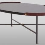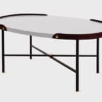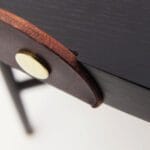 I bordet RINK har Eva Schildt lyckats kombinera fyra stycken material – metall, mässing, trä och skinn på ett otroligt vackert sätt. Alla har fått en egen form och plats, och tillsammans bildar dom bordets väldigt egna karaktär. Rink finns i svart- eller vitlaserad skiva i ekfanér med svart stålunderrede med mässings- och läderdetaljer.