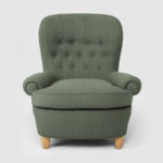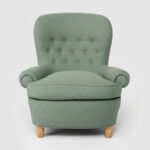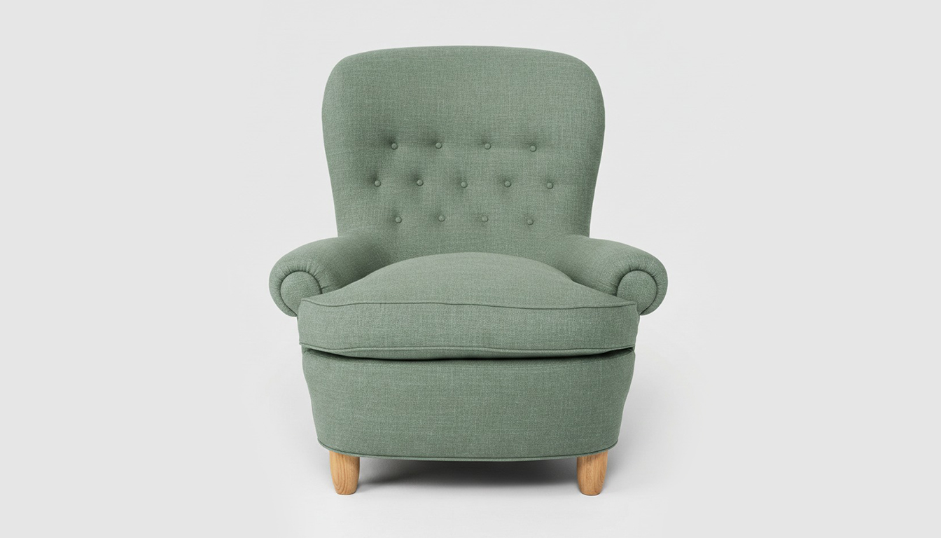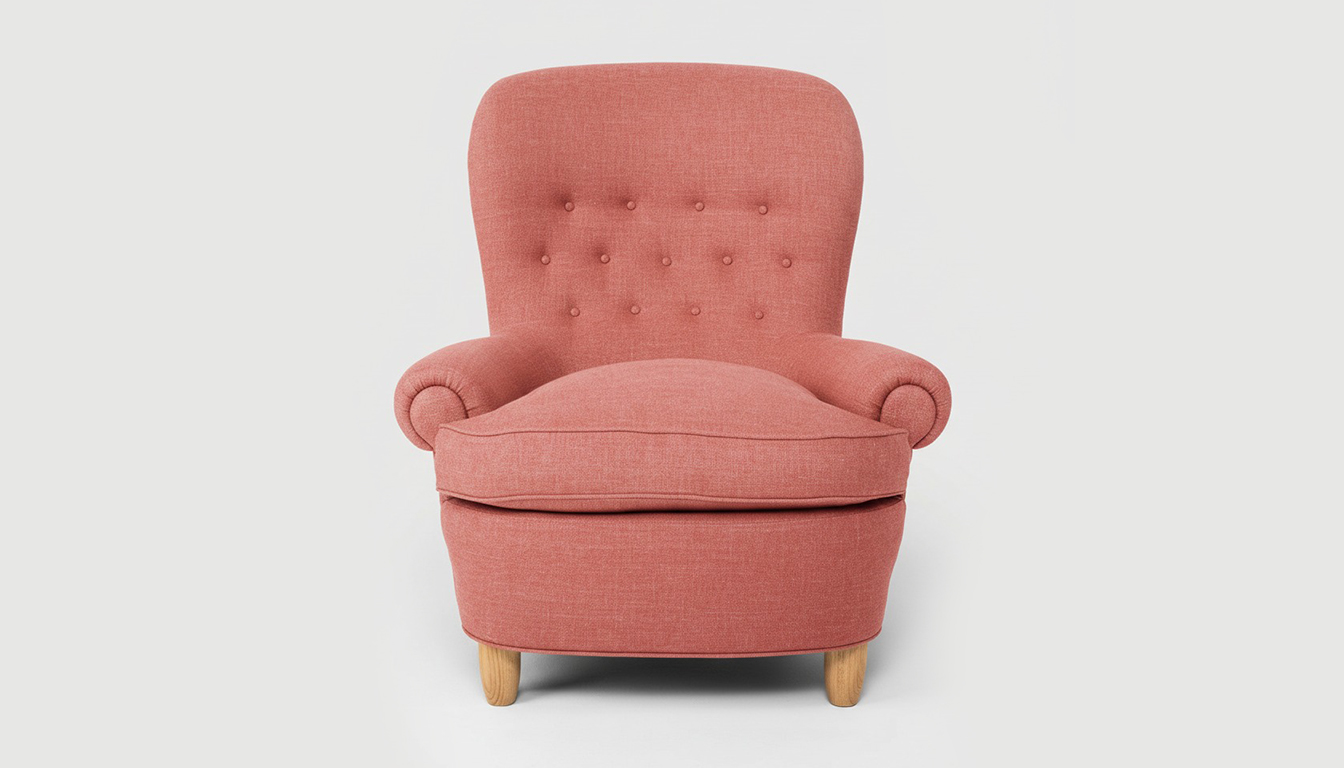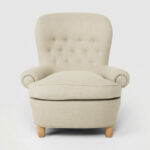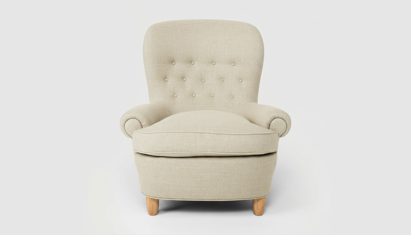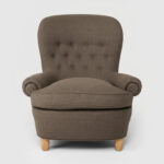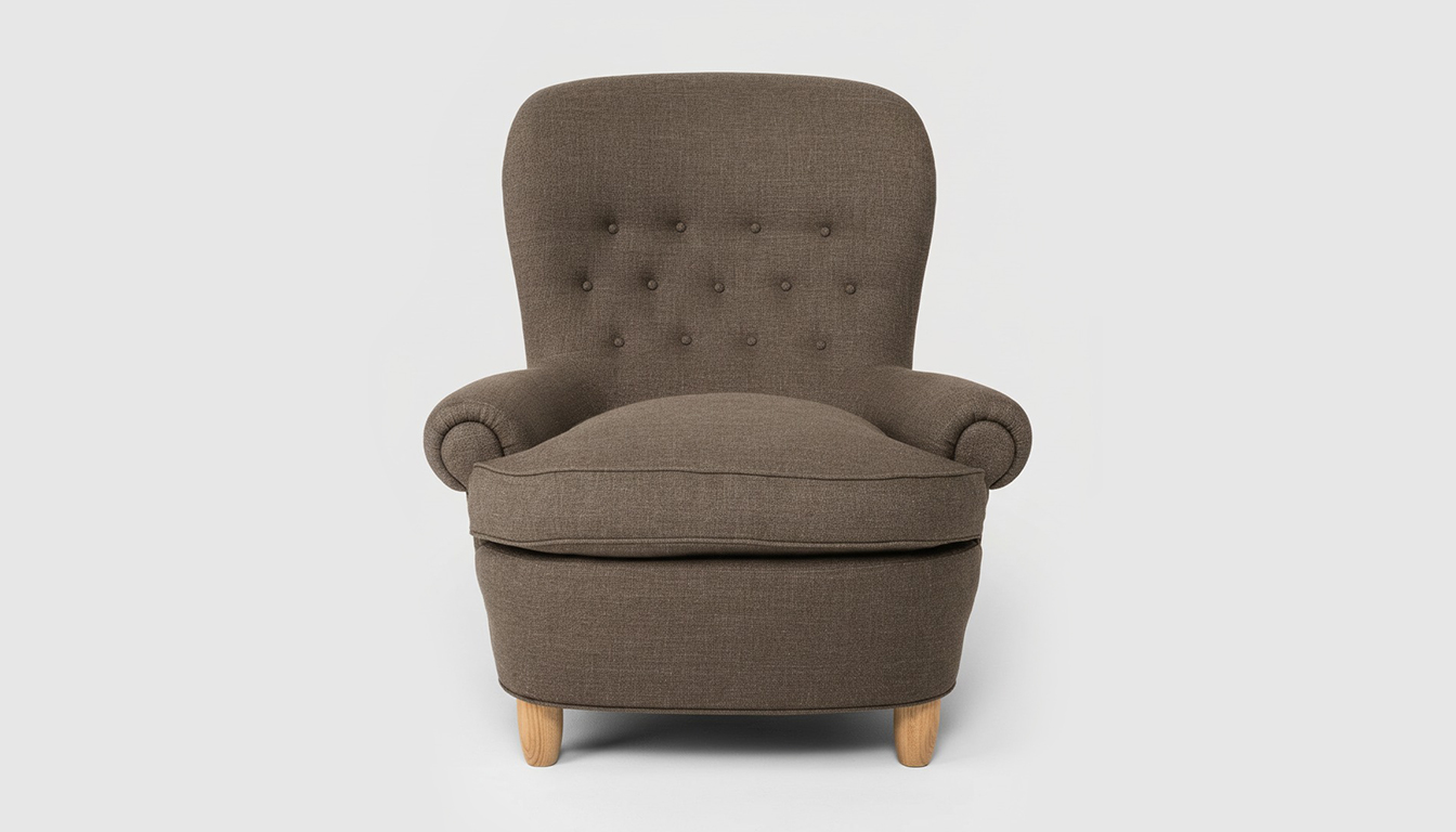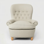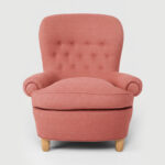 Fåtölj Jättepaddan, formgiven av Carl Malmsten, med en sittkomfort utöver det vanliga. Fåtöljen har en stomme av massiv furu.