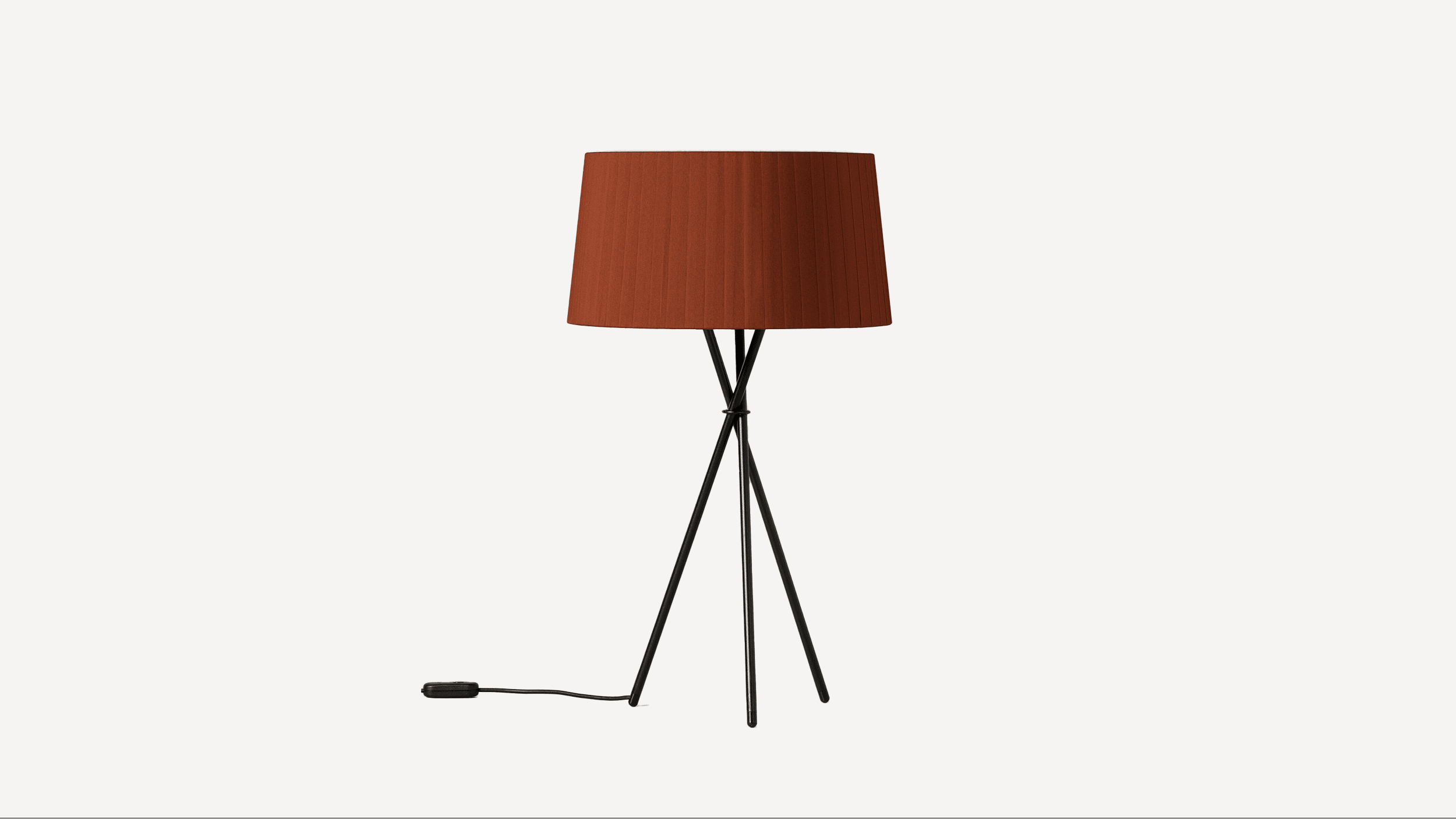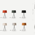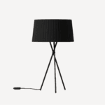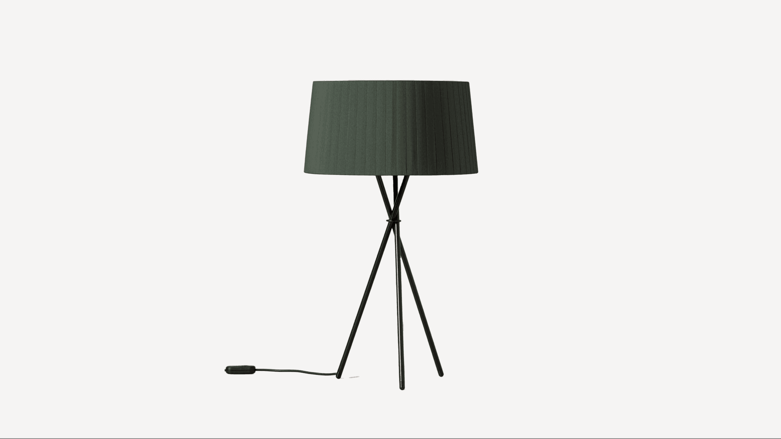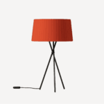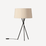 Trípode är en serie av bordslampor och den här populära golvversionen, förutom en pendelversionen. Användningen av handgjord bomullsband återinkorporerar traditionellt hantverk. Med ljuset på ger skuggan ett varmt ljus, rik på nyanser.