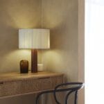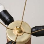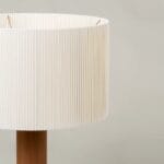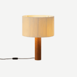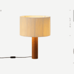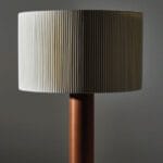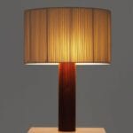 Foten är en robust träcylinder. Skärmen är gjord av bomullsband och har en sidentråd som löper längs kanten och bildar en asymmetri som skapar en fantastisk kontrast mellan ljus och skugga.