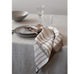 Ella linneservett är dekorerad med ett vackert mönster skapat med traditionell blocktrycksteknik. Blocktryck är en gammal hantverkstradition där mönstret graveras i träblock, färgas in och trycks för hand på tyget i lager. Resultatet är unikt och ger varje servett sin egen charm och karaktär.
