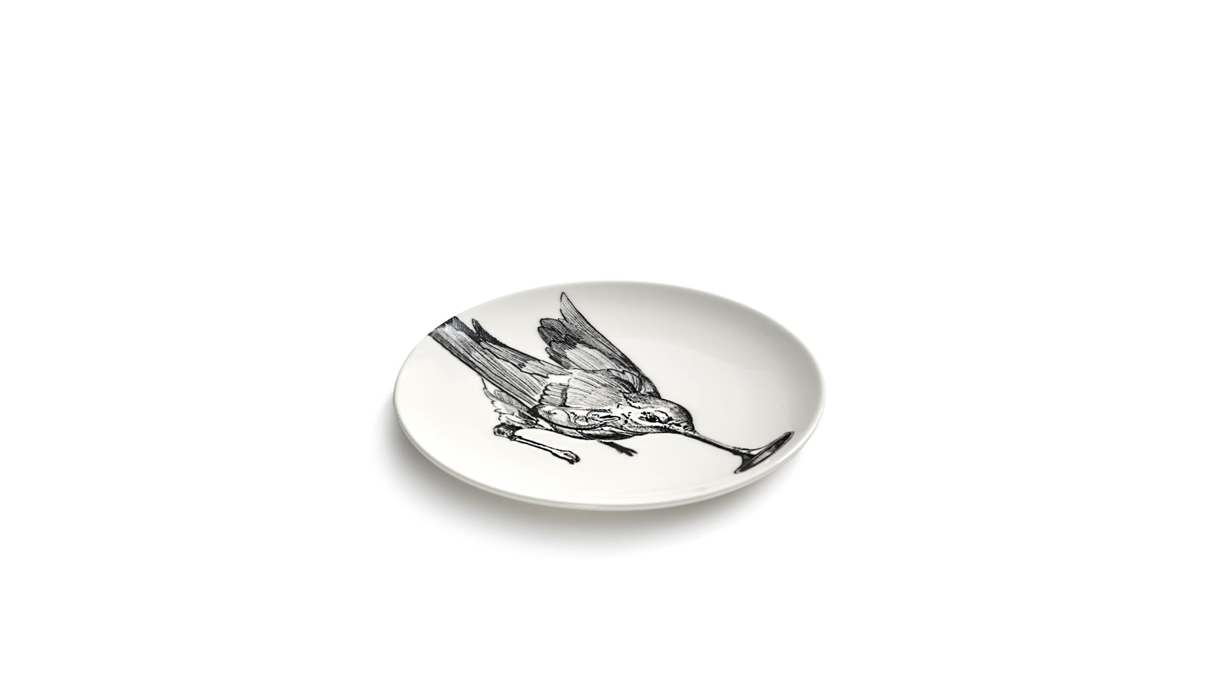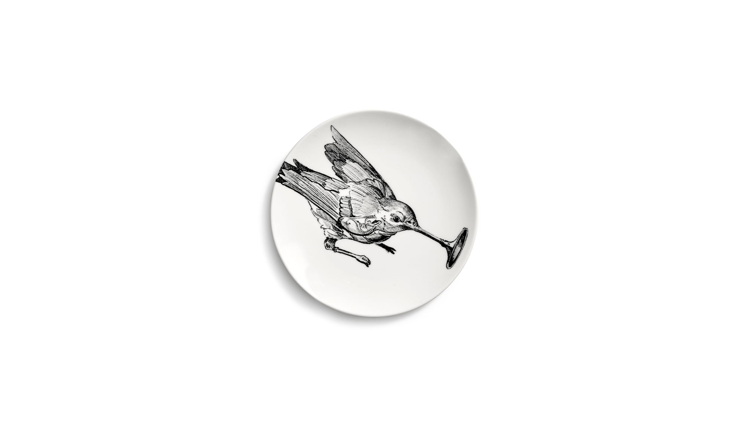 Ett litet fint fat i porslin, dekorerat i ett lekfullt mönster. Illustrerad och handritad av Tomorrowland. Finns i fyra olika motiv: Hummingbird, Butterfly, Sun och Mushrooms.