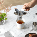 Tesil Blad består av två komponenter där behållaren fångar överblivet vatten. Blommans blad gör att det är enkelt att brygga te i både kanna som kopp. Formgivet av Eva Schildt för Klong.