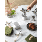 Eva Schildt älskar te. Nu har hon formgivit en unik tesil i serien Blad. Blommans blad gör att det är enkelt att brygga te i både kanna som kopp. Formens djup gör att tebladen får utrymme att blomma ut och ge mer smak. Tesilen består av två komponenter där behållaren fångar överblivet vatten. Tesilen är ett utmärkt komplement till te- och kaffeburkarna Blad.