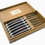Ett set med 6 st exklusiva grillknivar/stekknivar. Mörkt svarvat trähandtag och knivblad i högkvalitativt rostfritt stål. Ett klassiskt hantverk från franska Laguiole. Notera det fina biet som pryder ovansidan av dessa knivar, en symbol för Laguiole och Aveyron regionen i sydvästra Franrike.