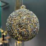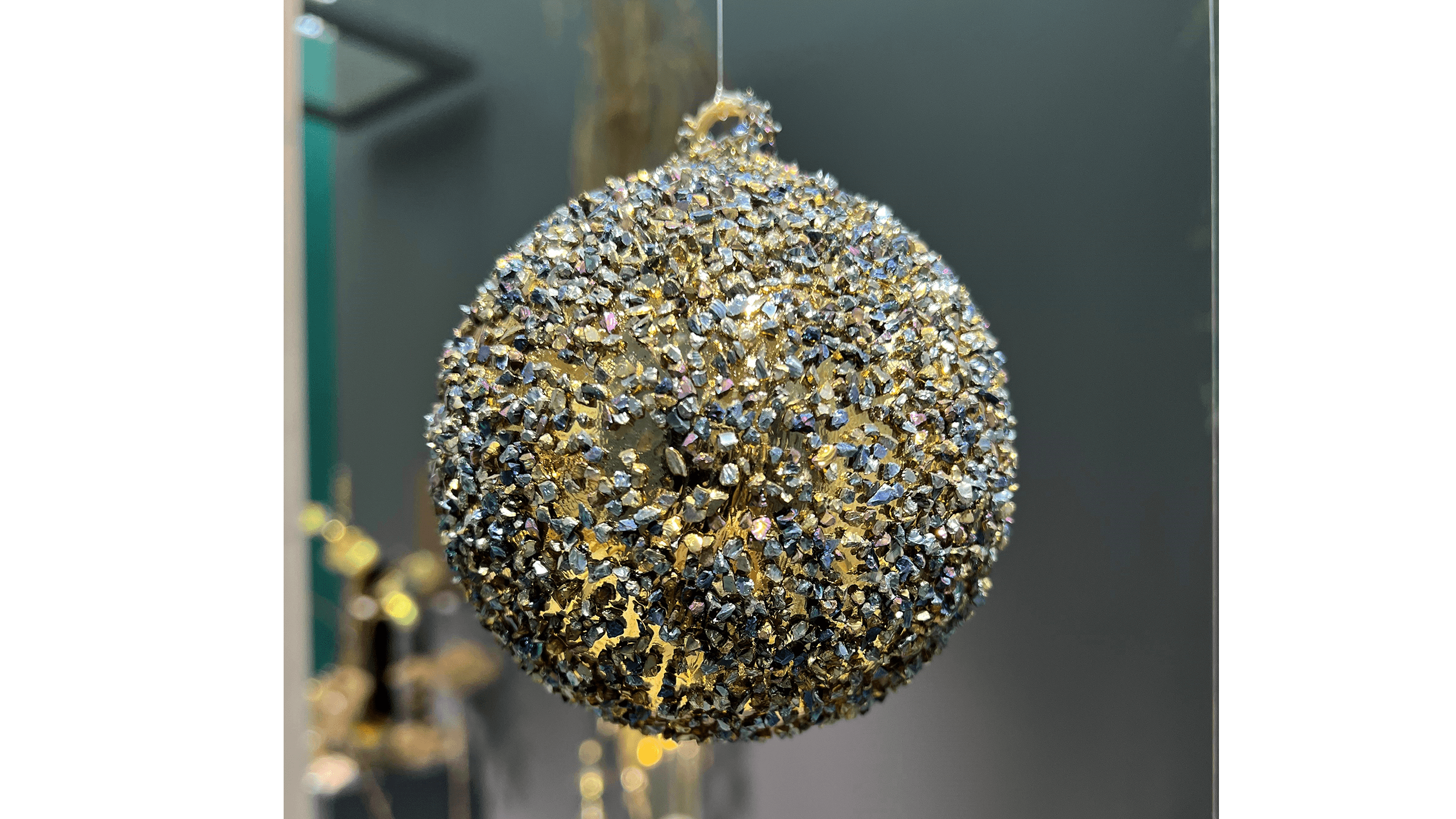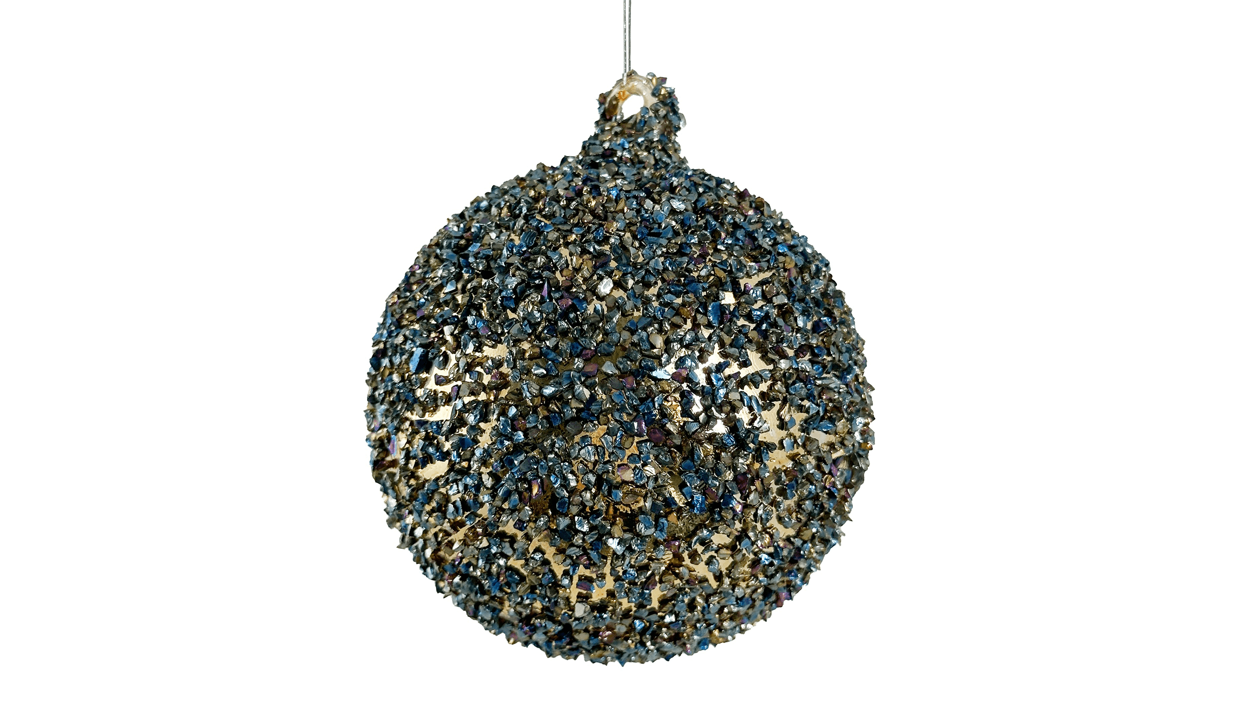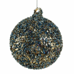 Sobert glashänge för att skapa en stämningsfull jul. Finns i 2 storlekar, 8 respektive 10 cm. Blågrönt glitter på guldfärgad botten.