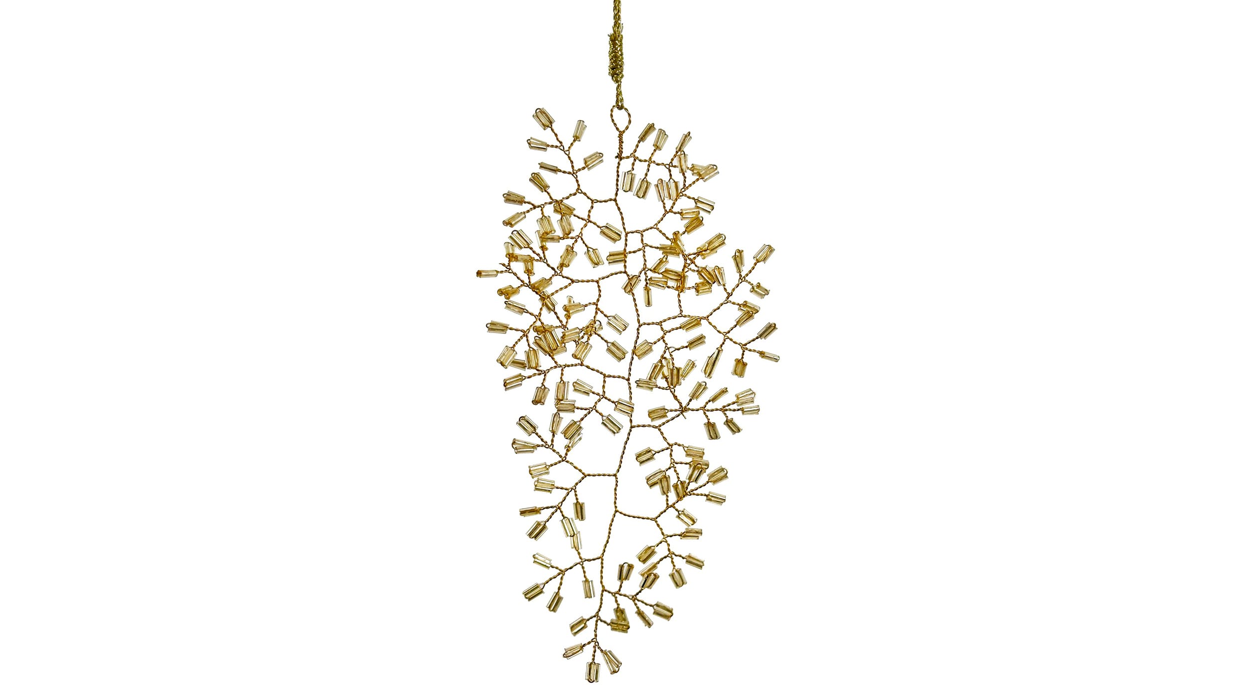 Skirt hänge format som ett löv av glaspärlor som slingrar på en guldtråd. 14 cm.
