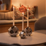 Idén till Merkurius började som en lek med pappersremsor. Genom att fortsätta vika remsor i olika storlekar och färger växte Synnöves idé fram – en sfärisk form i rörelse som sakta fick liv och karaktär. Från det experimentella pappret övergick designen till metall och där föddes Merkurius som ljusstake.