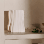 Vasen Moire är inspirerad av den grafiska effekten som uppstår när det organiska och geometriska krockar. Vasen har skapats genom en process med 3D-utskrift av lera, vilket resulterar i tunna lager som gradvis har format ett subtilt mönster över vasens kropp. Oglaserad utsida, glaserad insida.