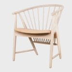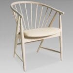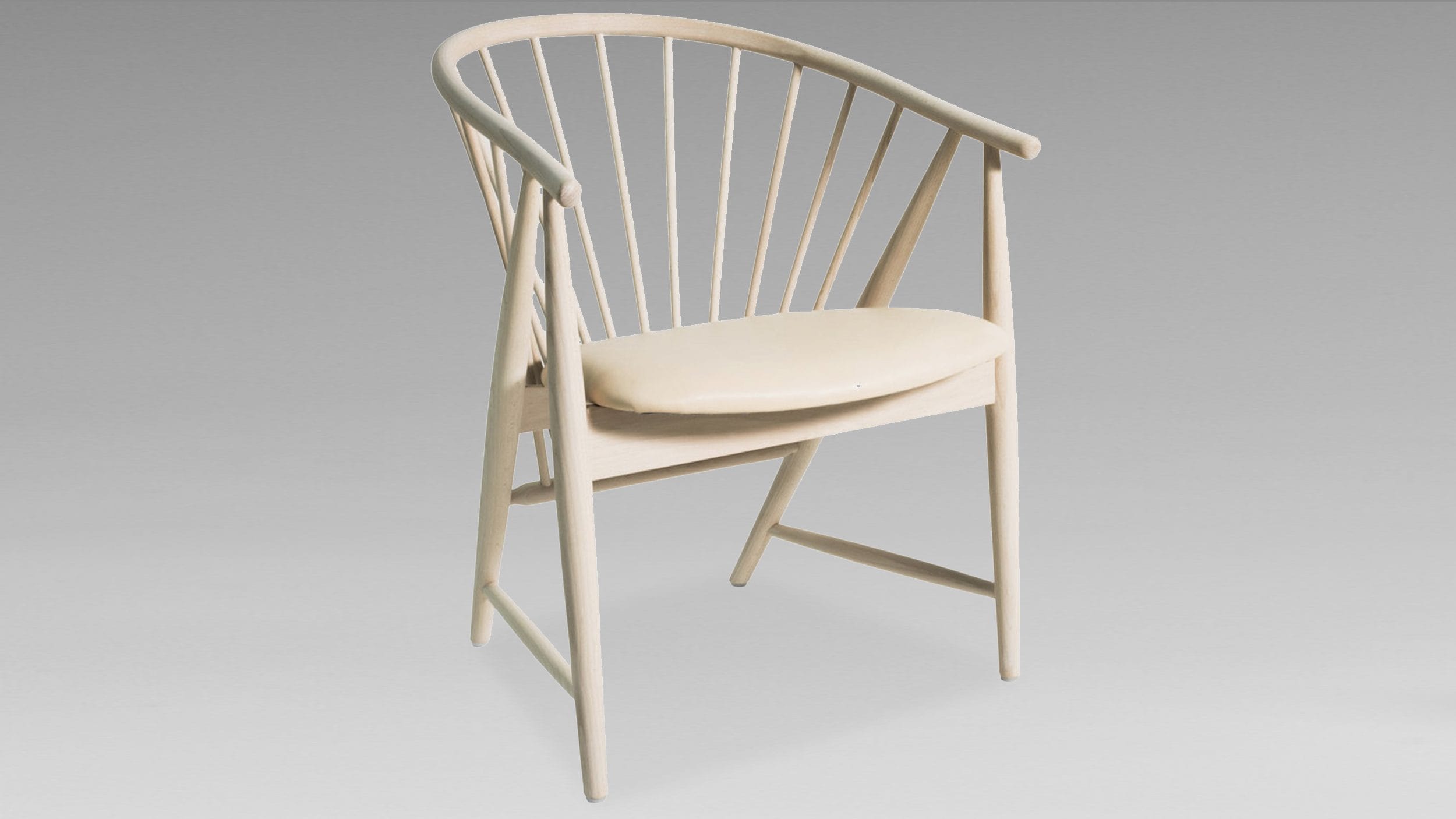 Fåtöljen Solfjädern i vit oljad massiv bok. Med en sits i Tärnsjö skinn i färgerna natur, cognac, mörkbrun alt. svart. Formgiven av Sonna Rosén och tillverkas av Gemla.